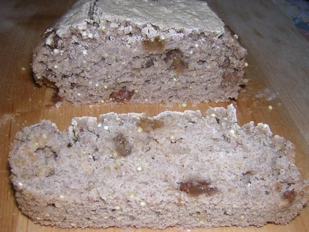 # 150g de farine de riz # 50g de farine de sarrasin # 20g de graines de quinoa # 1/2 c. à café de sel # 2 c. à soupe de poudre à lever sans gluten # 1 poignée de raisins secs # 25cl d'eau