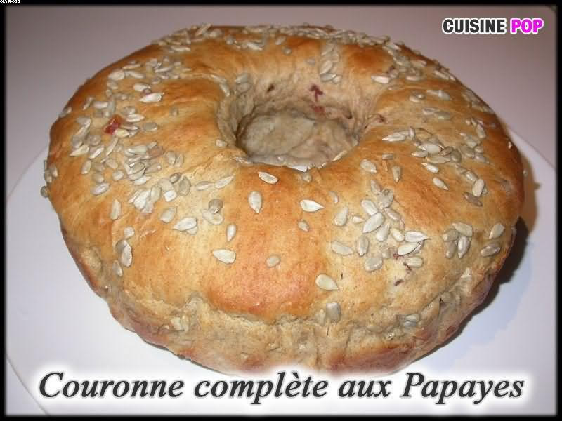 # 500 g de farine complète (T 110) avec levain + levure incorporée # 250ml de lait + 125ml # 75 g de sucre + 2 C. à s # 100 g de beurre # 1 oeuf # 175 g de papayes séchées # Graines de tournesol