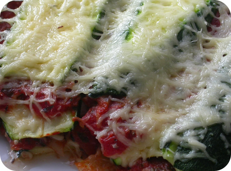 4. Tapissez le fond du plat avec des tranches de courgettes. Parsemez d'un peu de fromage végétal râpé et disposez la première couche de sauce tomate. Disposez par dessus les champignons. Parsemez à nouveau de fromage râpé. Ajoutez une nouvelle couche de tranches de courgettes, puis de fromage, puis de sauce tomate. Terminez avec une dernière couche de tranches de courgettes et parsemez du reste de fromage végétal râpé.