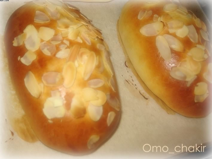 Dorer avec un jaune d'oeuf mélangé avec un peu de lait et sucre poudre. Mettre des amandes effilées sur les pains fourrés d'amandes.