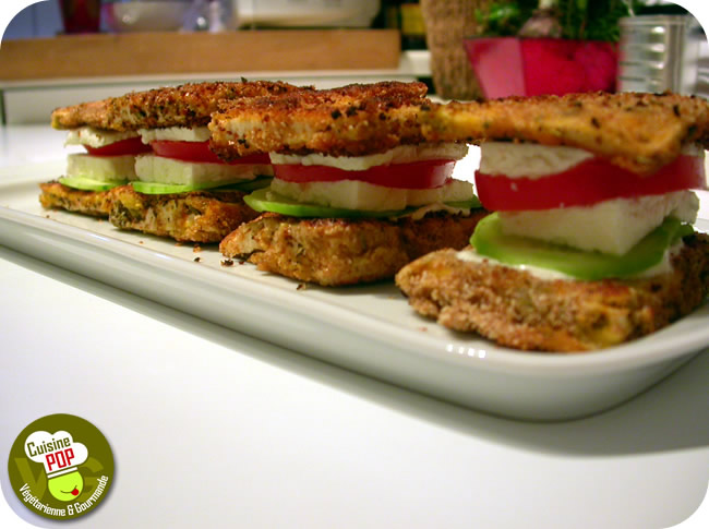 4. Dressez alors les croques : Diposez 1 tranche de tofu pané sur un plat, nappez de sauce au fromage blanc. Disposez 3 rondelles de concombre puis une tranche de feta. Puis une rondelle de tomate puis une autre tranche de feta. Nappez une nouvelle tranche de tofu pané et fermez le tout. Faites de même avec les autres croques.