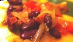 2. Faire mijoter les haricots cuits, les tomates, les oignons, le maïs, les petits pois avec les épices chili pendant 35 min à feu doux.