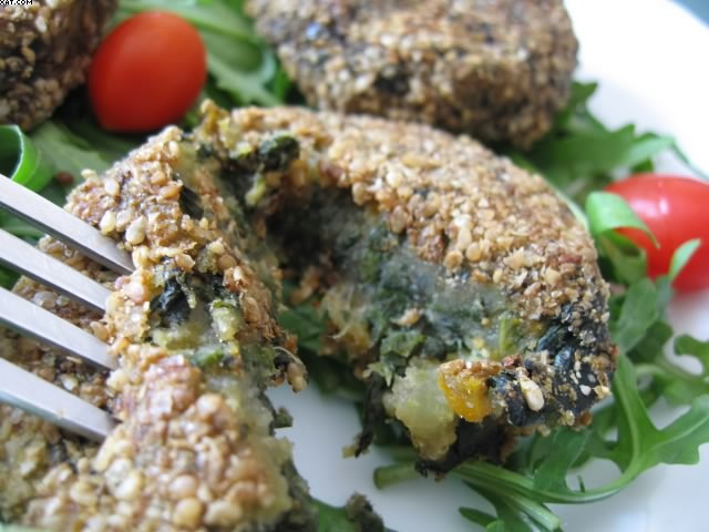 4. Former les croquettes assez épaisses et les paner dans le gomasio. Des déposer sur la plaque brûlante du four les cuire 20' en les retournant à mi cuisson.