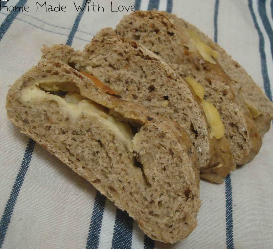 6. Une fois que le pain a gonflé, le cuire à 180°C pendant 30min. Vérifier la cuisson, la croûte doit être dorée et le pain doit sonner creux. Servir tiède, avec le fromage fondu au centre de chaque tranche.