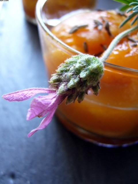 # 800 g d'abricots # 1 noix de gingembre frais # 5 c. à s. de sucre # 1 noix de beurre # 2 c. à café de fleurs de lavande