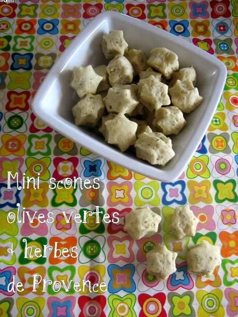 # Pour environ 40 tout petits scones: # 250 g de farine # 30 g de sucre en poudre # 1 paquet de levure chimique # 60 g de beurre salé très froid, coupés en petits dés, # 40 g de parmesan râpé # 15 cl de lait # 3 c. à s. de tapenade verte ou d'olives vertes hâchées # 2 c. à c. d'herbes de Provence.