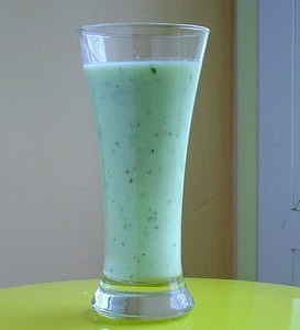 # 1 concombre # 1 piment doux ou, à défaut, un demi# poivron # 400 ml de lait fermenté # basilic et sel # facultatif : menthe et tomates cerises pour décorer