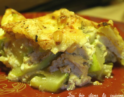 # 1 kg courgettes # 3 œufs # 2 gousses d'ail # 350g de crème soja # 2 c. à s. de Tahin (purée de sésame) # 2 c. à s. de purée d'amande blanche # jus d'1/2 citron # Fromage râpé ( végétal ou non) # 20g pignons de pin # sel, poivre, muscade