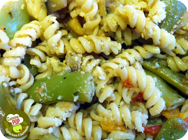 # 200g de Fusillis au blé complet # 1 aubergine # 1 tomate cœur de boeuf # 1 tomate jaune # 400g de haricots plats surgelés # 1 oignon # 2 c. à soupe de jus de citron # 3 c. à soupe de coriandre surgelée # 5 cl d'huile d'olive # Sel et poivre # Parmesan végétal