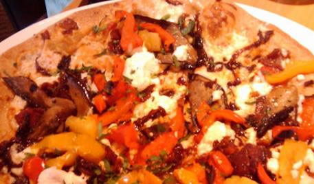 # Pour 6 pizzas individuelles : # 4 poivrons rouges doux bio, moyens # 6 gousses d'ail bio coupées en tranche # 6 c. à soupe d'huile d'olive bio # 225 g de fromage de chèvre bio, en miettes