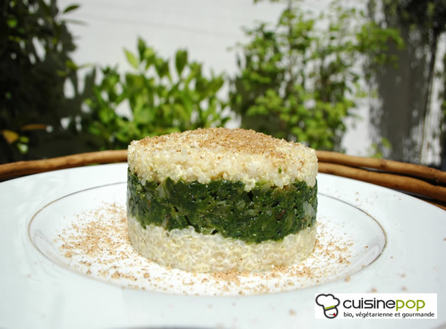 3. Dressez les timbales à l'aide d'un emporte-pièce : Disposez la moitié du quinoa dans le fond puis ajoutez les épinards et terminez avec le reste du quinoa.